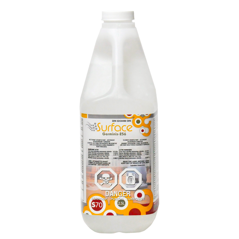 Surface GERMINIX-256 est un produit nettoyant et désinfectant neutre sans phosphate conçu pour nettoyer, désodoriser et désinfecter efficacement les hôpitaux, maisons de soins infirmiers, hôtels, écoles, établissements de traitement des aliments, restaurants où la propreté des lieux est de première importance afin de contrôler les risques d'inter contamination par les surfaces traitées. Désinfectant dont l’utilisation contre la COVID-19 a été prouvée (Santé Canada). DIN 02434490.